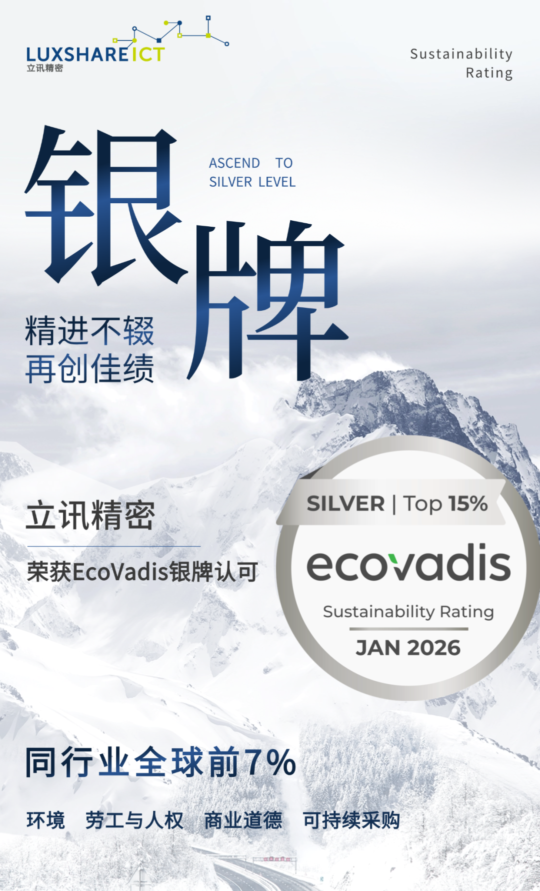 近日,在全球企业可持续发展权威评级机构EcoVadis新一轮评估中,立讯精密评分与等级双双提升,自铜牌晋升至银牌,进一步跻身全球参评企业的前15%,同行业全球前7%,标志着公司的ESG管理体系与实践持续精进至世界领先水平。